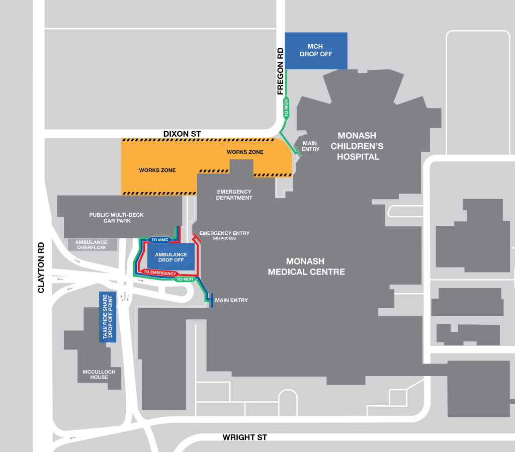 Paediatric emergency is located in Monash Medical Centre. The emergency department is open 24 hours a day, seven days a week. The closest parking to paediatric emergency is available in the Monash Medical Centre’s public multideck car park, accessible from Clayton Road.
